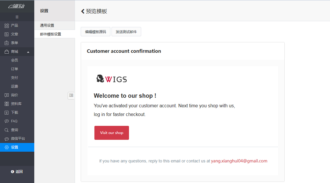 在郵件模板列表上點擊每個郵件后面的【預覽】按鈕,就可以進入對應郵件模板的預覽頁面,可支持【編輯模板源碼】和【發(fā)送測試郵件】兩個操作: